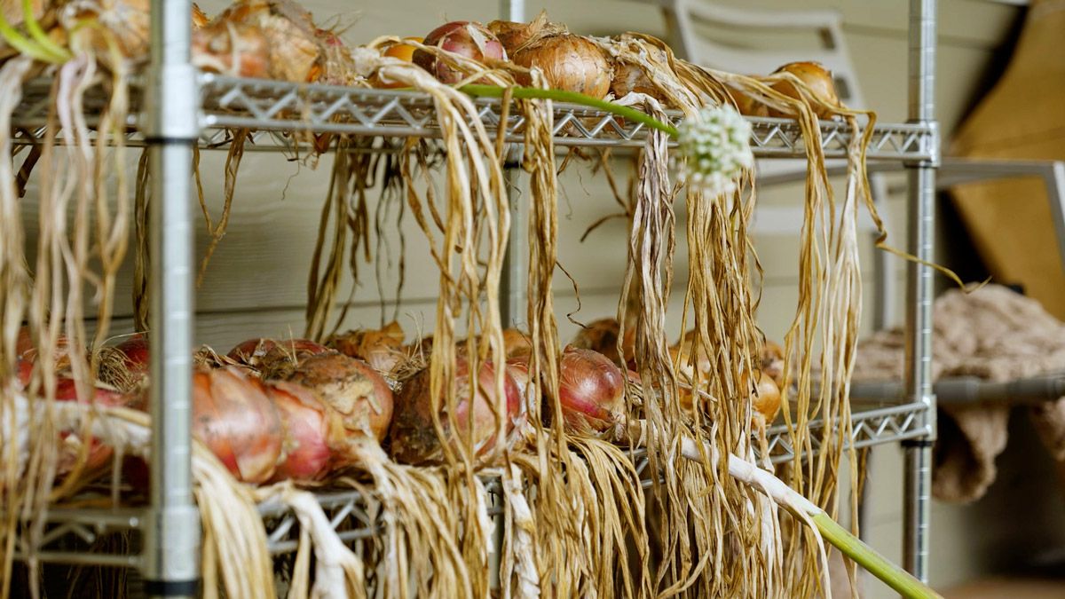 Curing is the process of drying onions so their outer skins become papery and the necks seal shut. This step greatly improves their ability to last in storage.